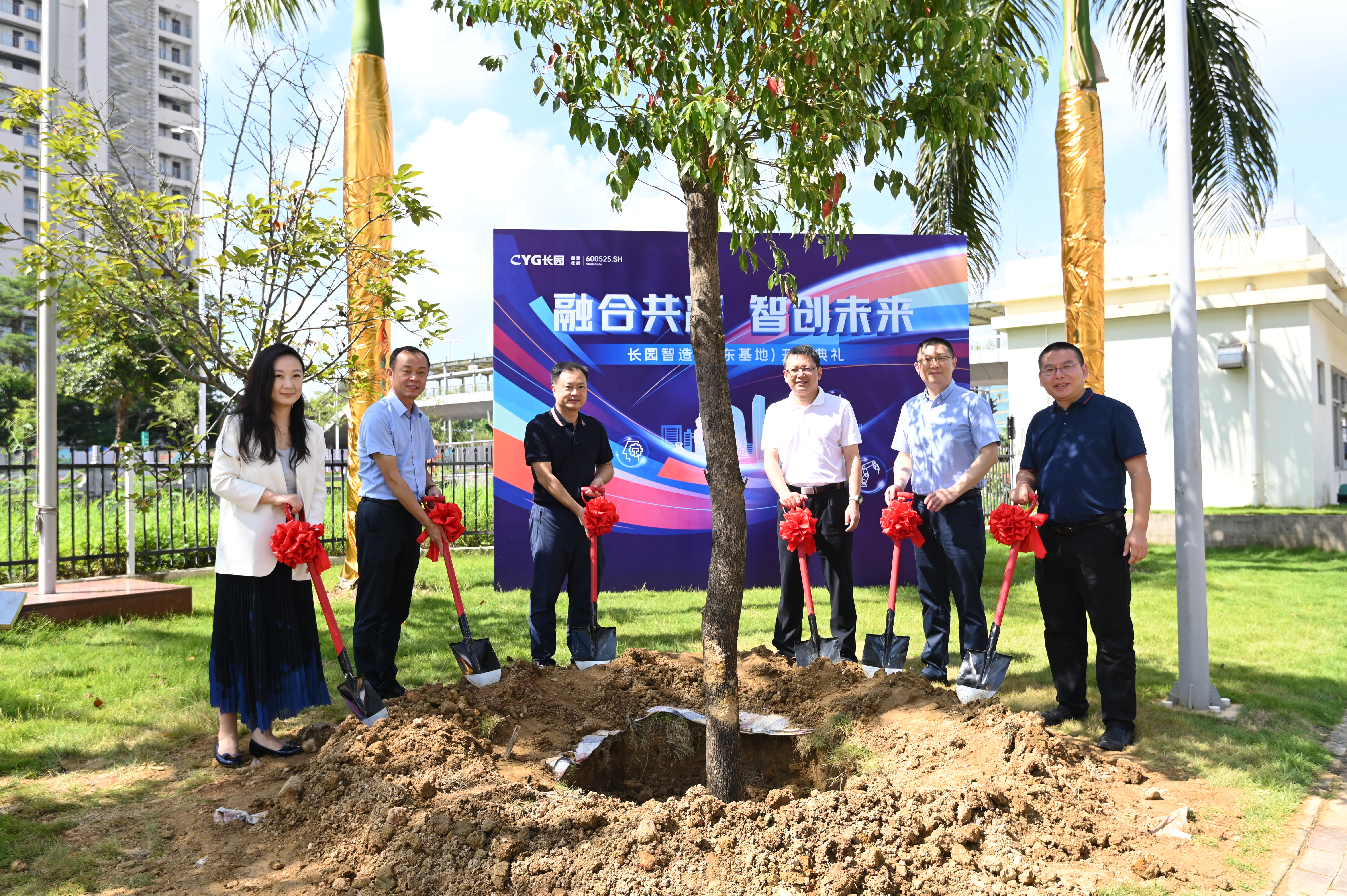 上午10点,珠海市高新区党工委委员、区管委会副主任薛飞,格力集团党委书记、董事长周乐伟,格力集团总裁助理、格信发展公司董事长程敏,中欧zoty科技集团董事长、总裁吴启权,中欧zoty科技集团董事长特别助理朱晓军,中欧zoty智能装备总经理熊胜辉共同为仪式进行剪彩并在基地种下一颗香樟树以作纪念,香樟树枝繁叶茂,四季常青,寓意着中欧zoty智造(广东基地)必将像香樟树一样生命力顽强旺盛、扎根高新区繁荣生长,成为高新区里的一棵参天大树。植树添绿共谱新篇,中欧zoty的发展迈出了又一关键的里程碑。